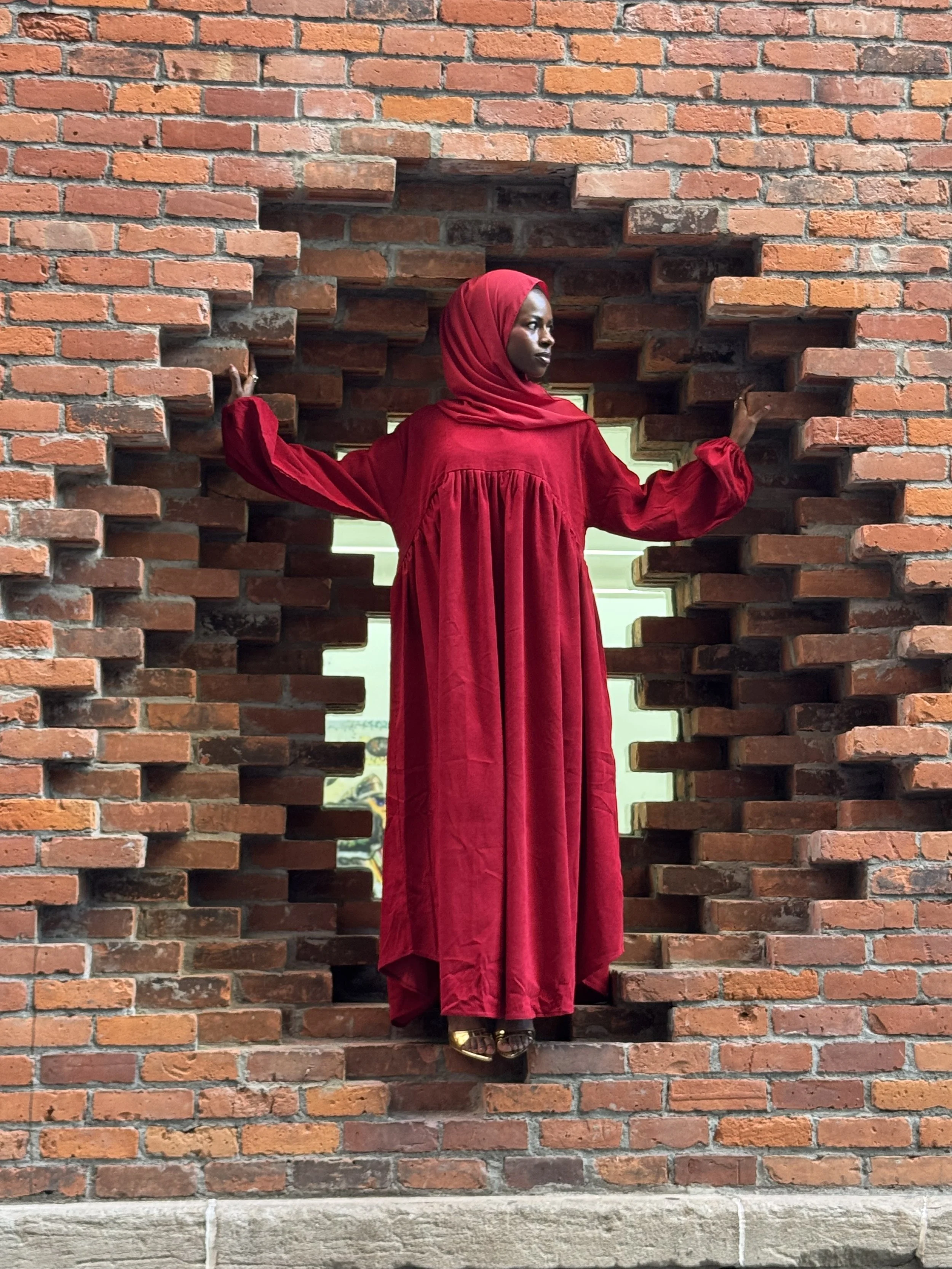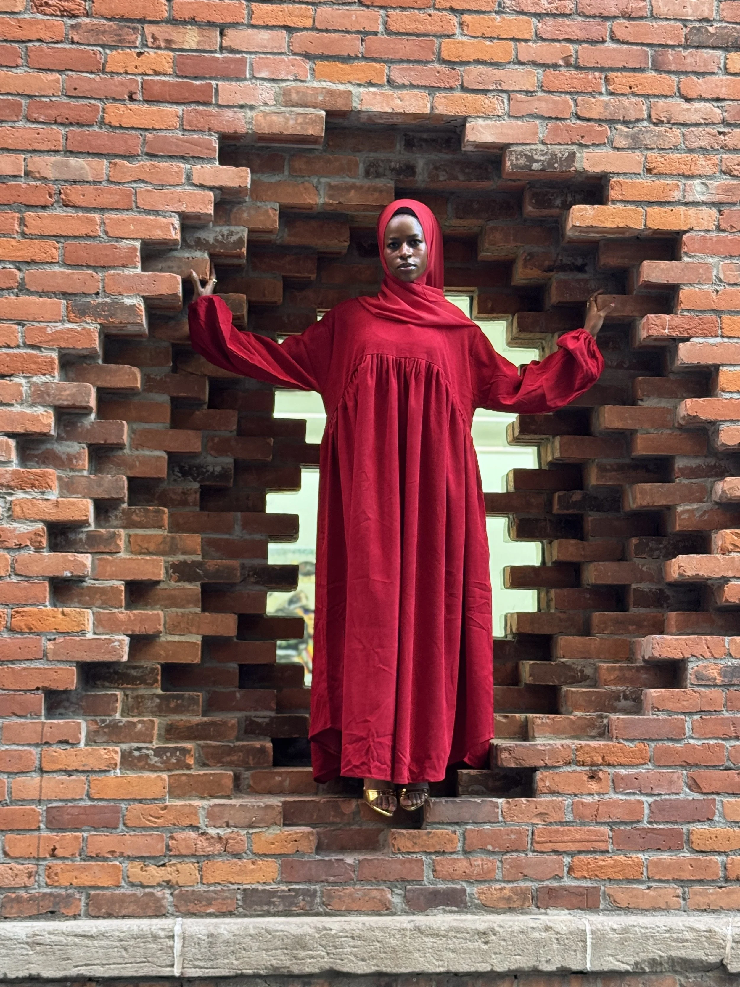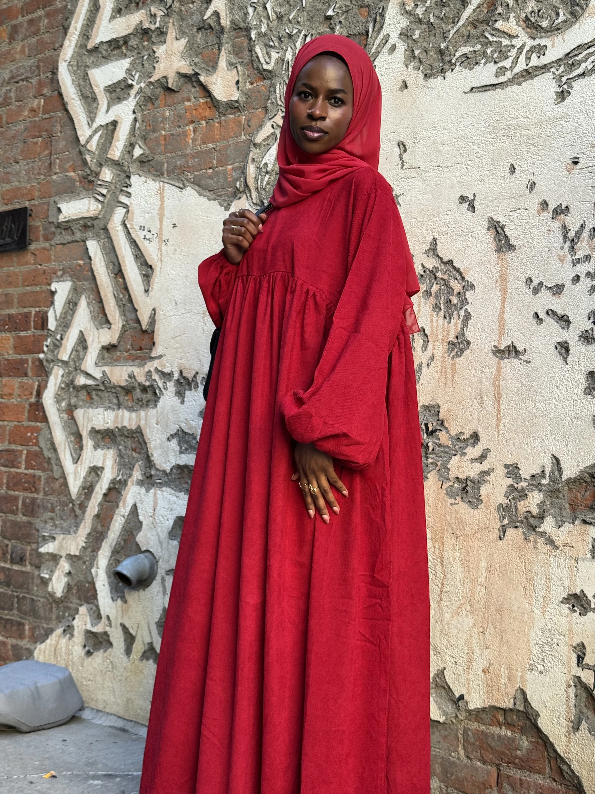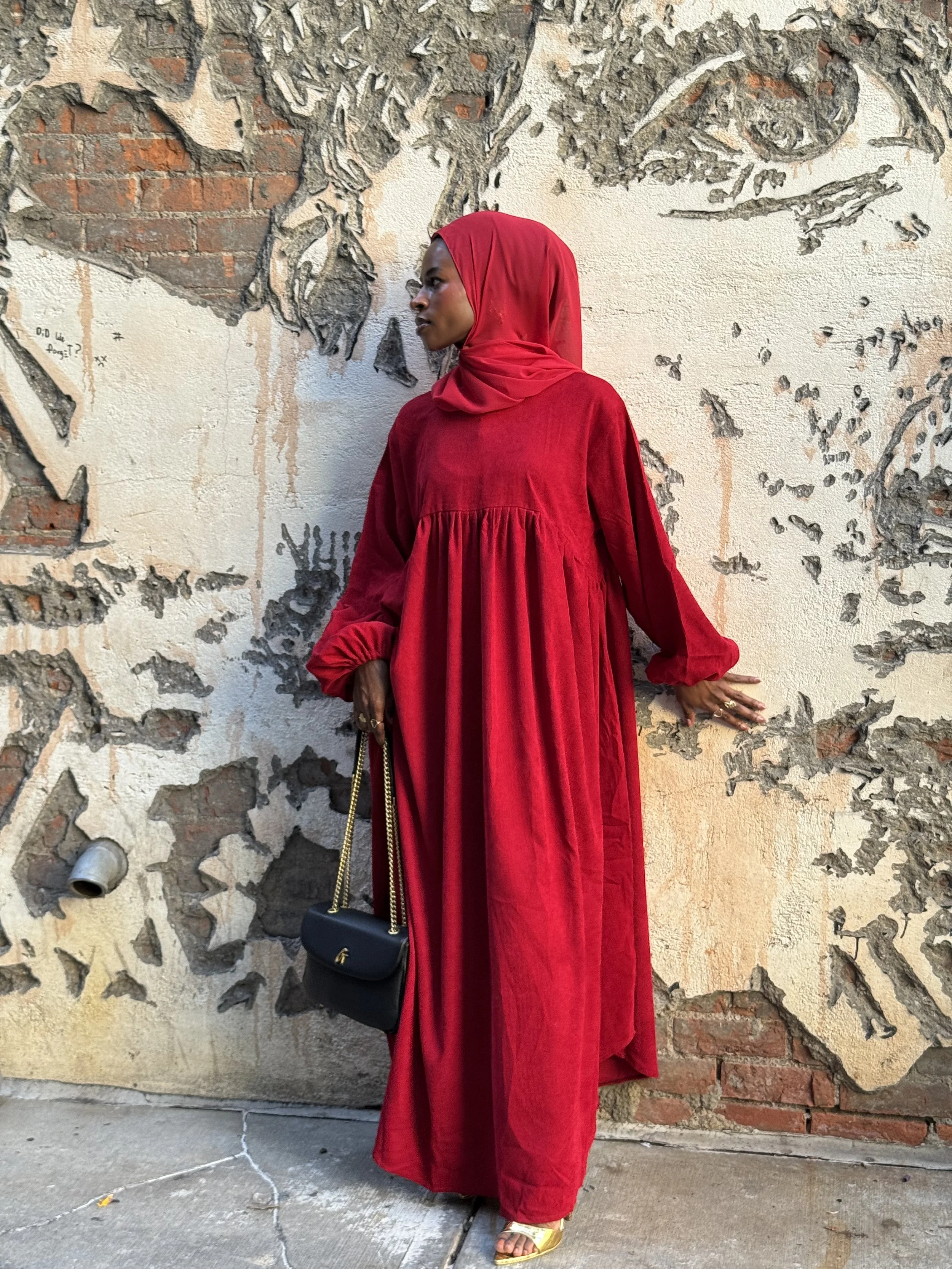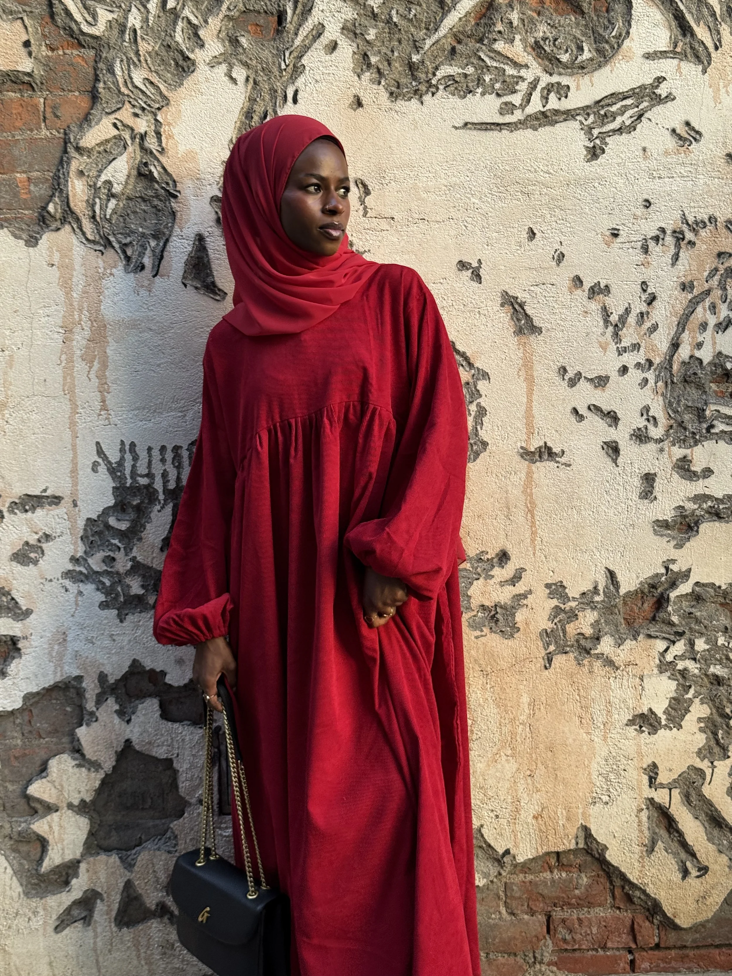 This corduroy abaya dress features delicate pleats that highlight its elegance and versatility. Designed as a free-form silhouette, it can be styled up or down for any occasion. Perfect for fall and winter, it keeps you warm without clinging, unlike typical abayas. Complete your look with the included matching hijab for effortless, coordinated style.